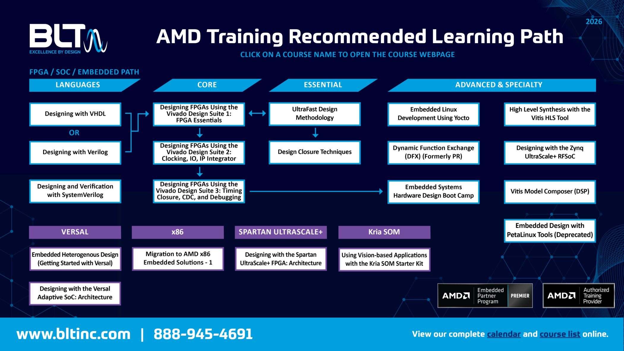 BLT offers over 50+ AMD FPGA courses, including hands-on labs, interactive discussions & best practices to leverage your success in your projects and career. Not sure which class is right for you? Our FPGA Learning Path can help.